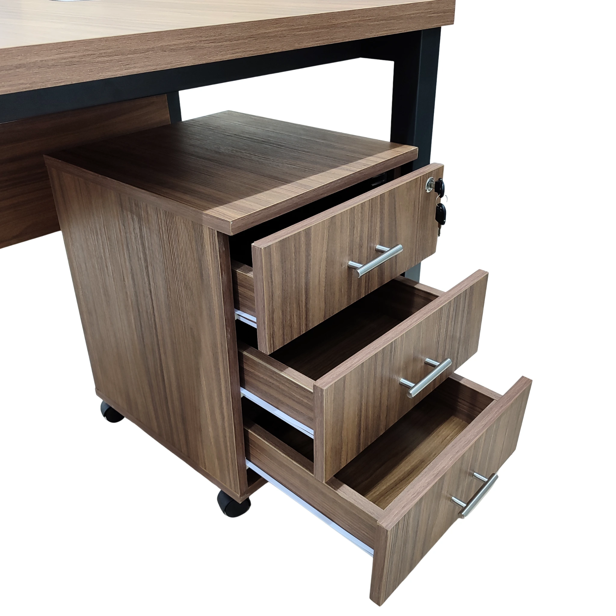 Le bureau est également doté d’un caisson mobile à 3 tiroirs verrouillables, offrant un espace de rangement sécurisé pour vos documents, fournitures et objets essentiels. Ce design pratique garantit une organisation optimale et contribue à maintenir un environnement de travail ordonné. Que vous soyez un professionnel ou un étudiant, ce bureau répond à vos besoins en matière de fonctionnalité et de confort.