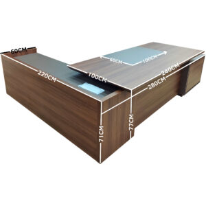 Fabriqué en panneaux MDF stratifiés, ce bureau combine une robustesse indéniable avec une esthétique raffinée. Parfaitement adapté à un environnement de direction moderne, il allie confort, élégance et fonctionnalité, faisant de vos journées de travail une expérience exceptionnelle.