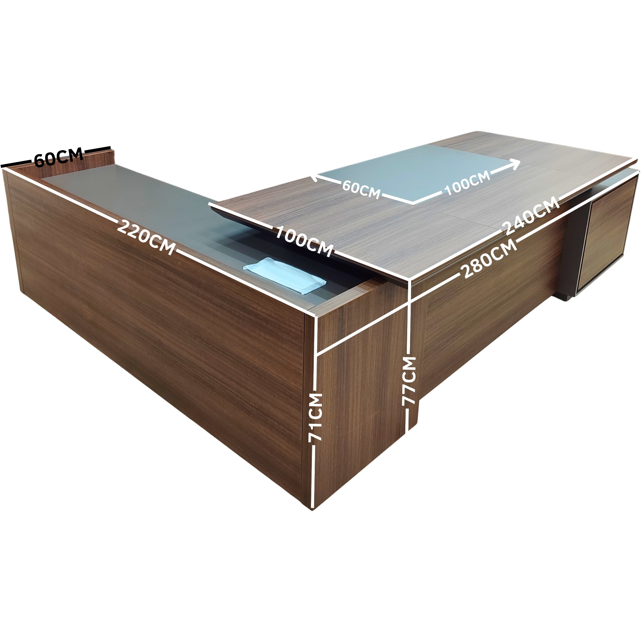 Pratique et esthétique, la partie centrale de ce bureau est dotée d’un insert visuel gris clair de 60 x 100 cm, ajoutant une touche de modernité tout en facilitant l’organisation de vos documents et supports de travail. Le retour latéral, mesurant 220 cm de long sur 60 cm de profondeur et à 71 cm de hauteur, crée un ensemble en L parfaitement structuré qui optimise non seulement l’espace, mais aussi votre expérience de travail.