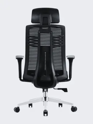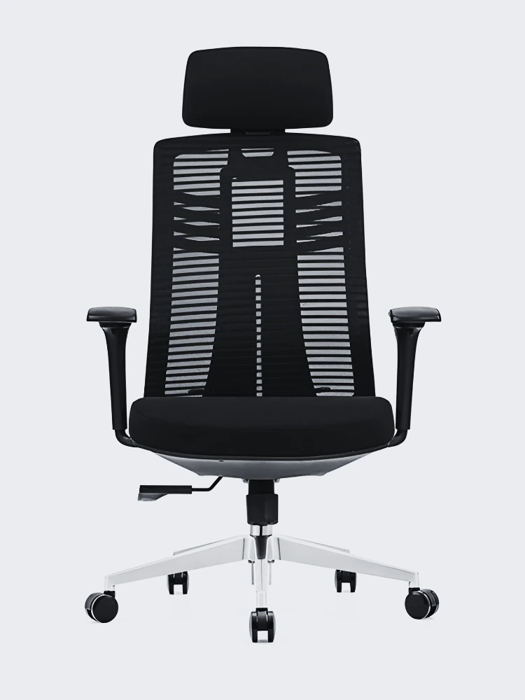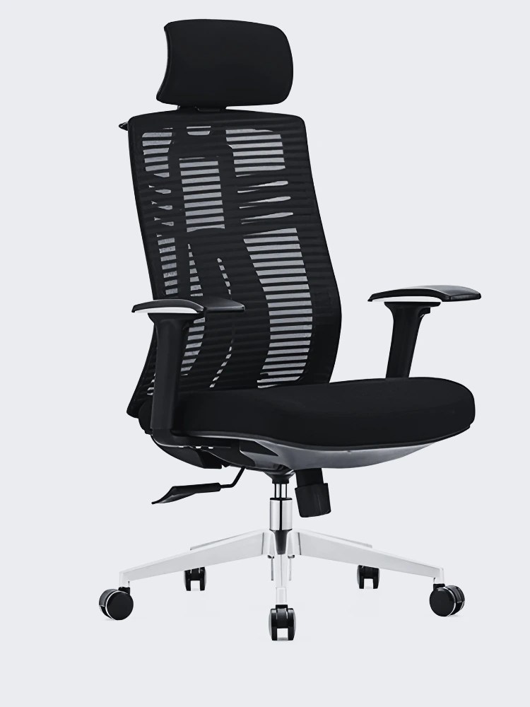 Chaise ergonomique avec dossier mesh respirant, appui-tête réglable et accoudoirs confortables pour un soutien optimal. Sa base métallique robuste assure stabilité et durabilité. Idéale pour les professionnels et le télétravail, elle améliore la posture et le confort durant de longues heures de travail.