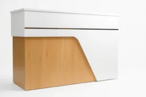 Ce comptoir combine du bois clair chaleureux et une finition blanche laquée sophistiquée, garantissant durabilité et style. Les matériaux soigneusement sélectionnés assurent la robustesse nécessaire pour un usage quotidien dans un environnement professionnel. Sa conception réfléchie lui permet de s’intégrer aisément à des décors variés, qu’ils soient modernes, minimalistes ou classiques.