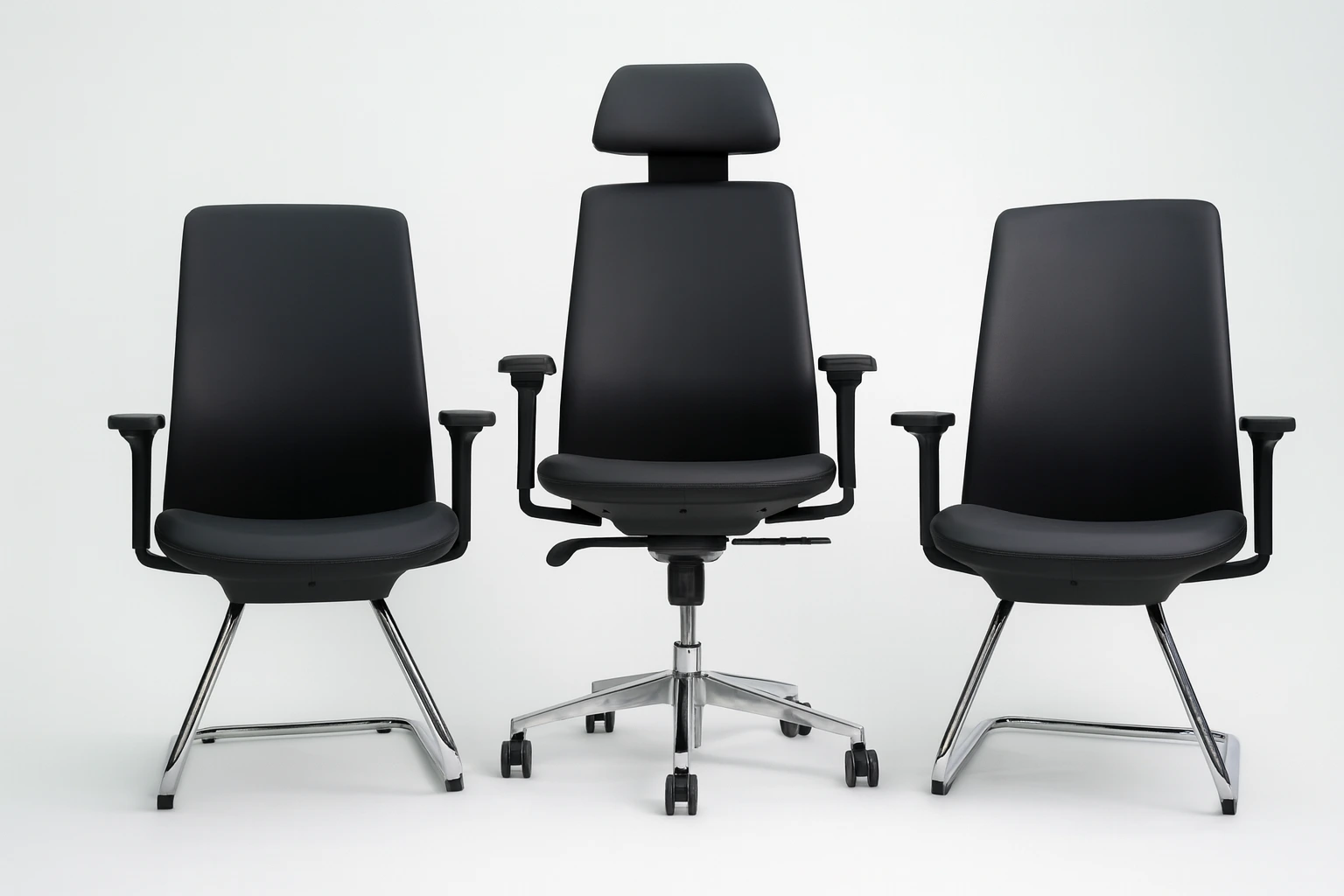 Ensemble professionnel composé d’un fauteuil de direction ergonomique réglable à roulettes et de deux chaises visiteurs fixes en simili cuir noir. Alliant confort, design moderne et finitions haut de gamme, il est idéal pour bureaux et salles de réunion, offrant élégance, stabilité et une atmosphère professionnelle raffinée.